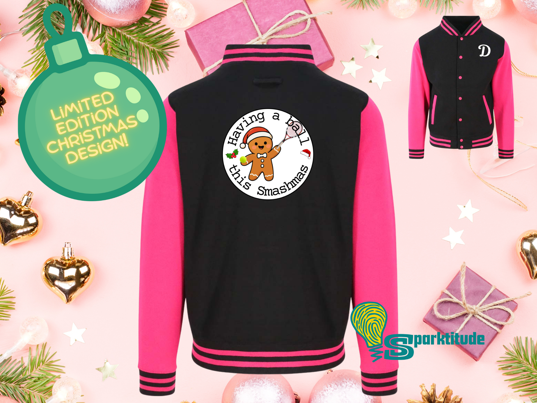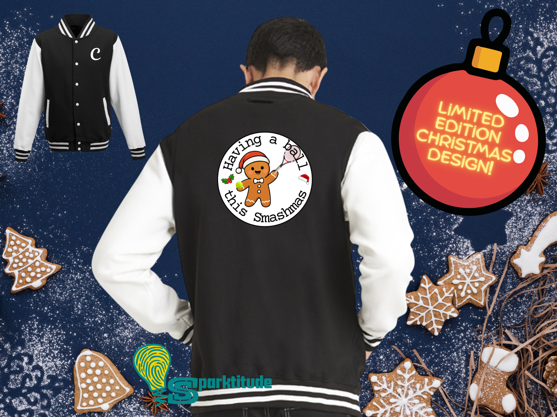 Are you ready for the most magical time of the year? We’re so excited about our first Sparktitude Christmas, and we have been busy designing some super cute Christmassy designs to celebrate tennis! They are a great way to show off your love of your favourite sport in a festive way! Our gingerbread tennis player varsity-style jacket is part of our Gingerbread Logo range, featuring the most smashing gingerbread dude in town. This jacket (or one of the other great items also available in this design) is perfect for any child who loves tennis!