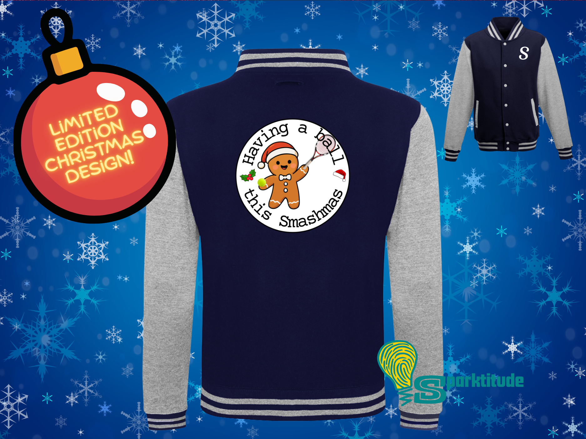 Are you ready for the most magical time of the year? We’re so excited about our first Sparktitude Christmas, and we have been busy designing some super cute Christmassy designs to celebrate tennis! They are a great way to show off your love of your favourite sport in a festive way! Our gingerbread tennis player varsity-style jacket is part of our Gingerbread Logo range, featuring the most smashing gingerbread dude in town. This jacket (or one of the other great items also available in this design) is perfect for any child who loves tennis!